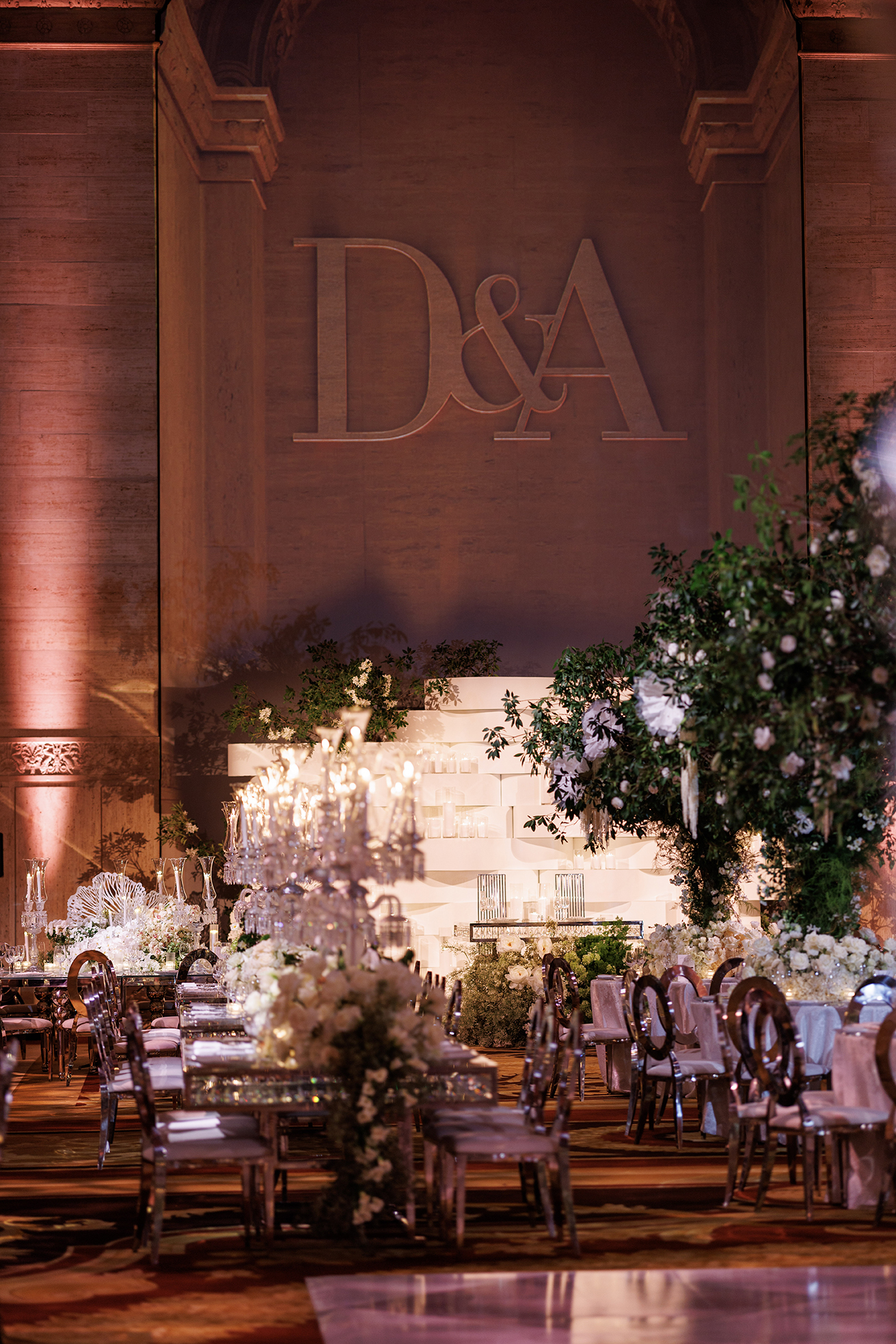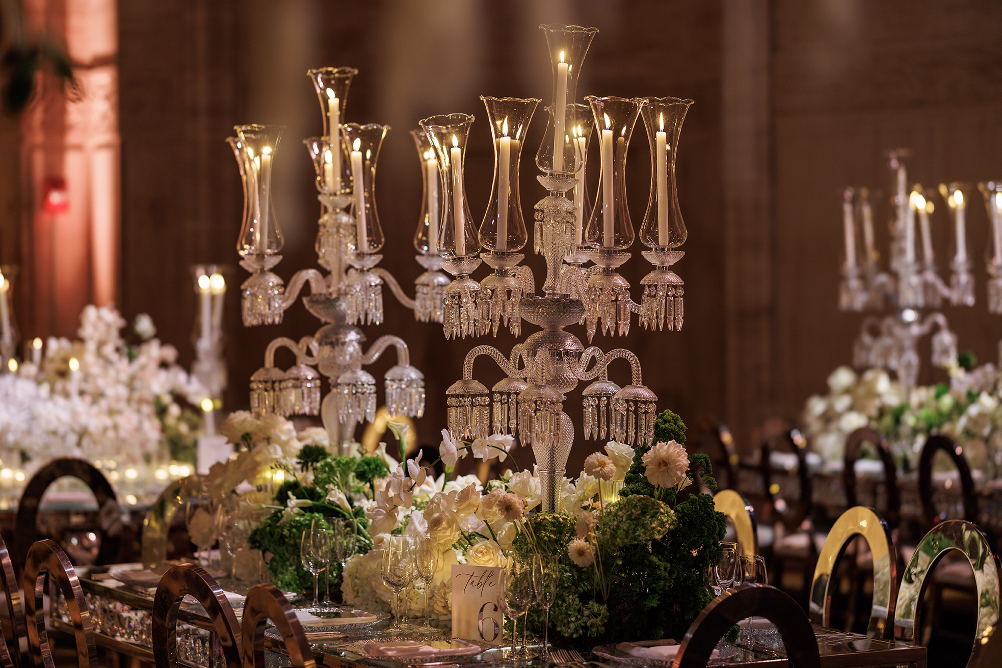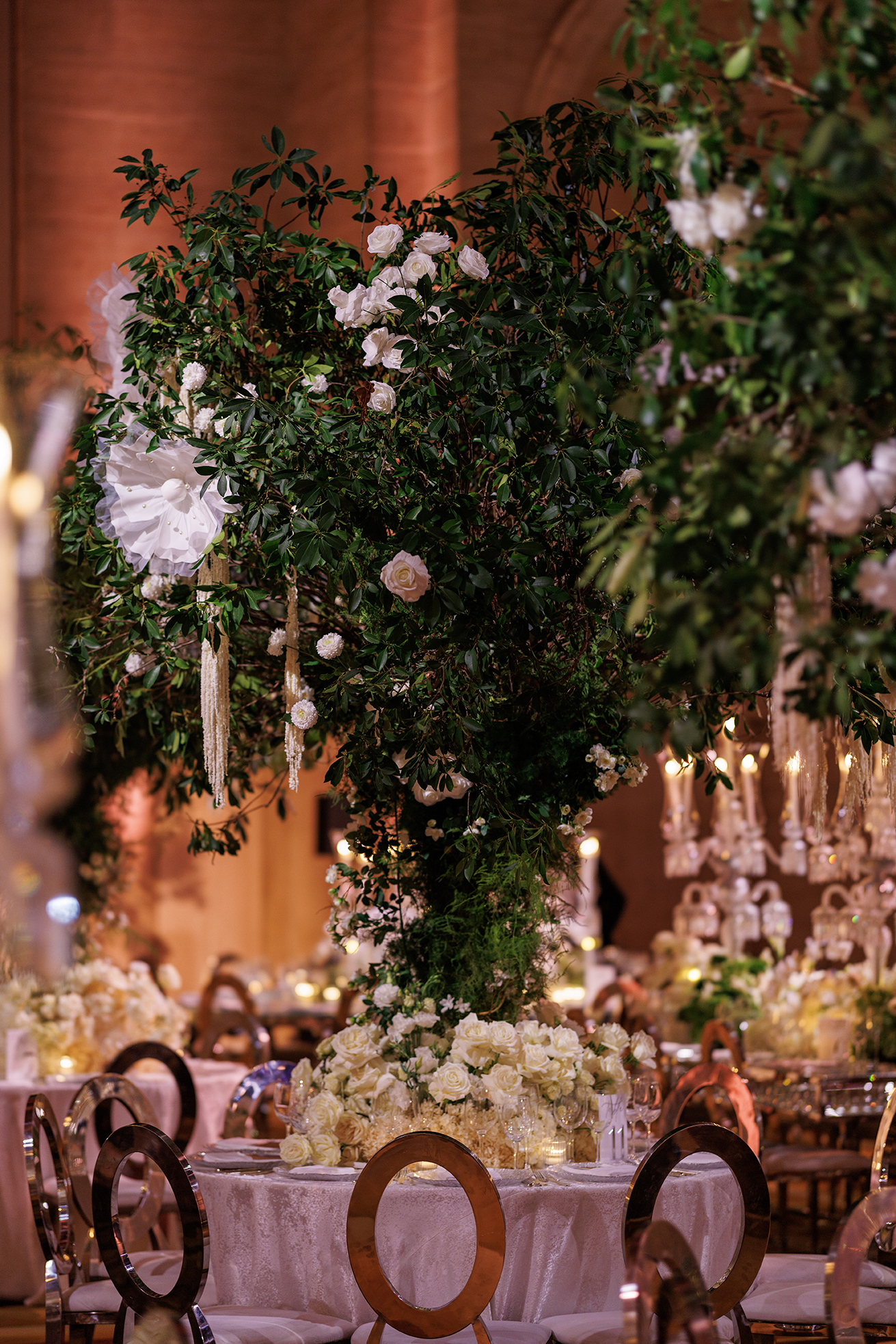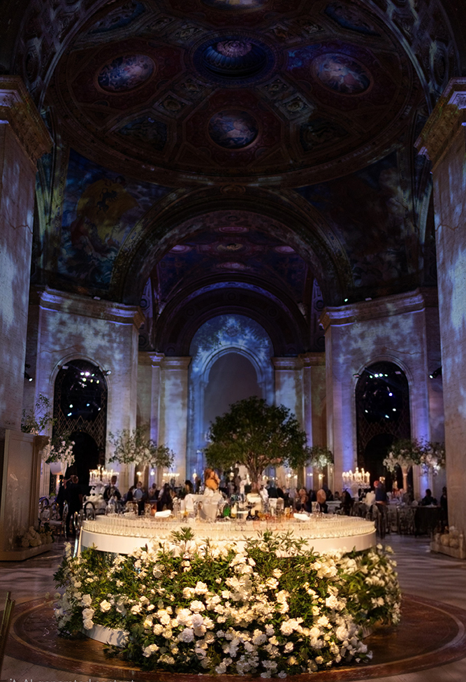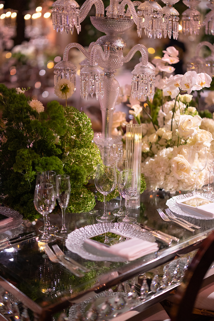 The design highlight of the evening was the luxurious Baccarat crystal chandeliers, which glistened above mirrored tables and reflected the delicate light of the candles. Our team incorporated large live green trees to add natural depth and drama, balancing the glamour of crystal and glass with the organic beauty of nature. Every floral arrangement, from the grand entrance to the tablescapes, was carefully crafted to embody refined luxury and a sense of effortless romance.