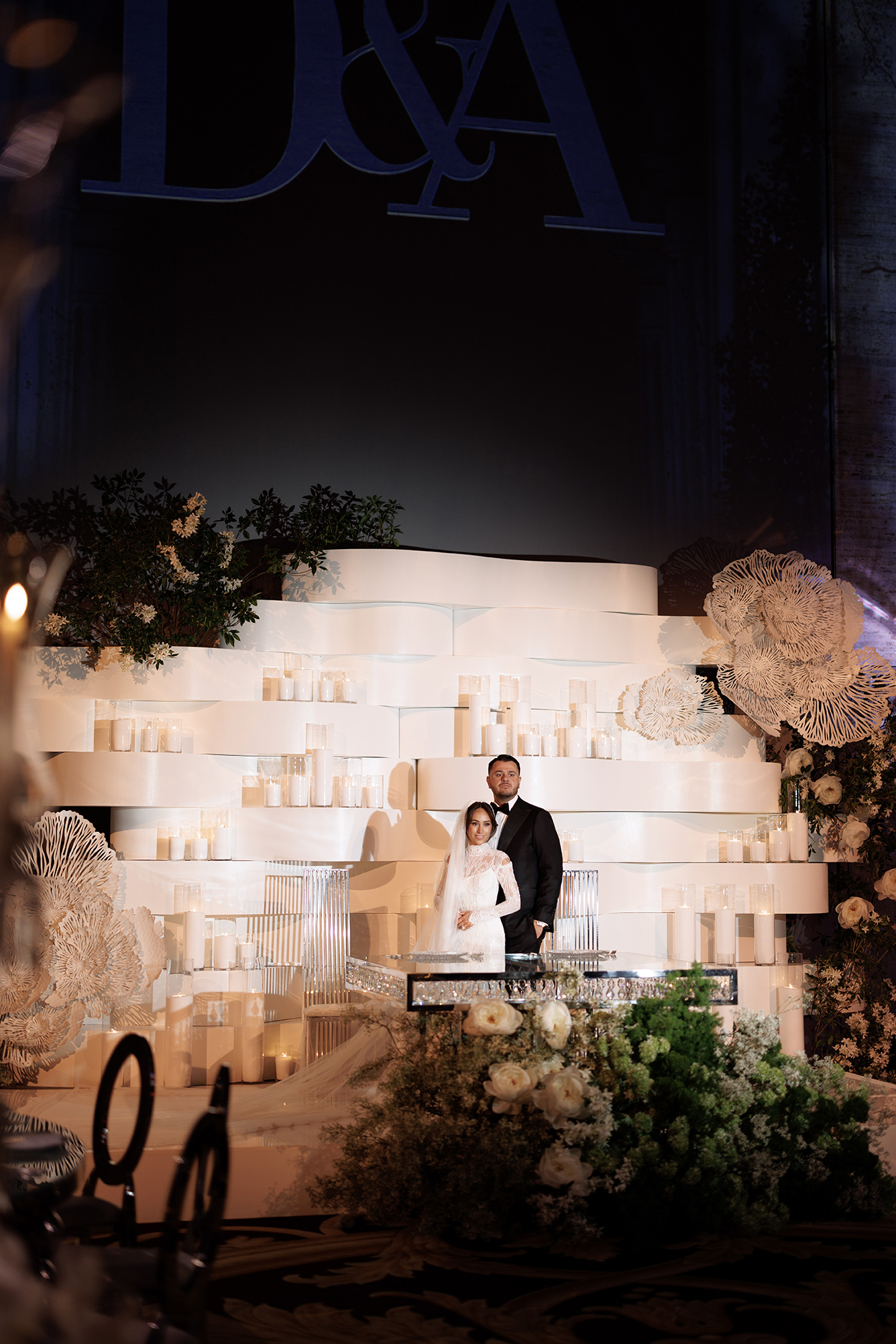Sarcon Flower Couture had the honor of designing a breathtaking luxury wedding at the iconic Cipriani in New York City for Dominique and Alfonse. The couple envisioned a setting that was both romantic and grand, blending modern sophistication with timeless elegance. We brought that dream to life with a custom high-end floral backdrop layered with soft white tones, sculptural textures, and countless candles that bathed the space in a warm, intimate glow. Lush greenery and ivory blooms created a serene yet opulent atmosphere that perfectly complemented Cipriani’s architectural beauty.
