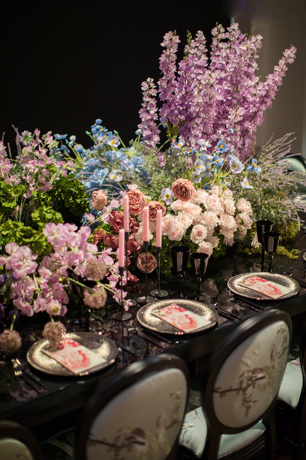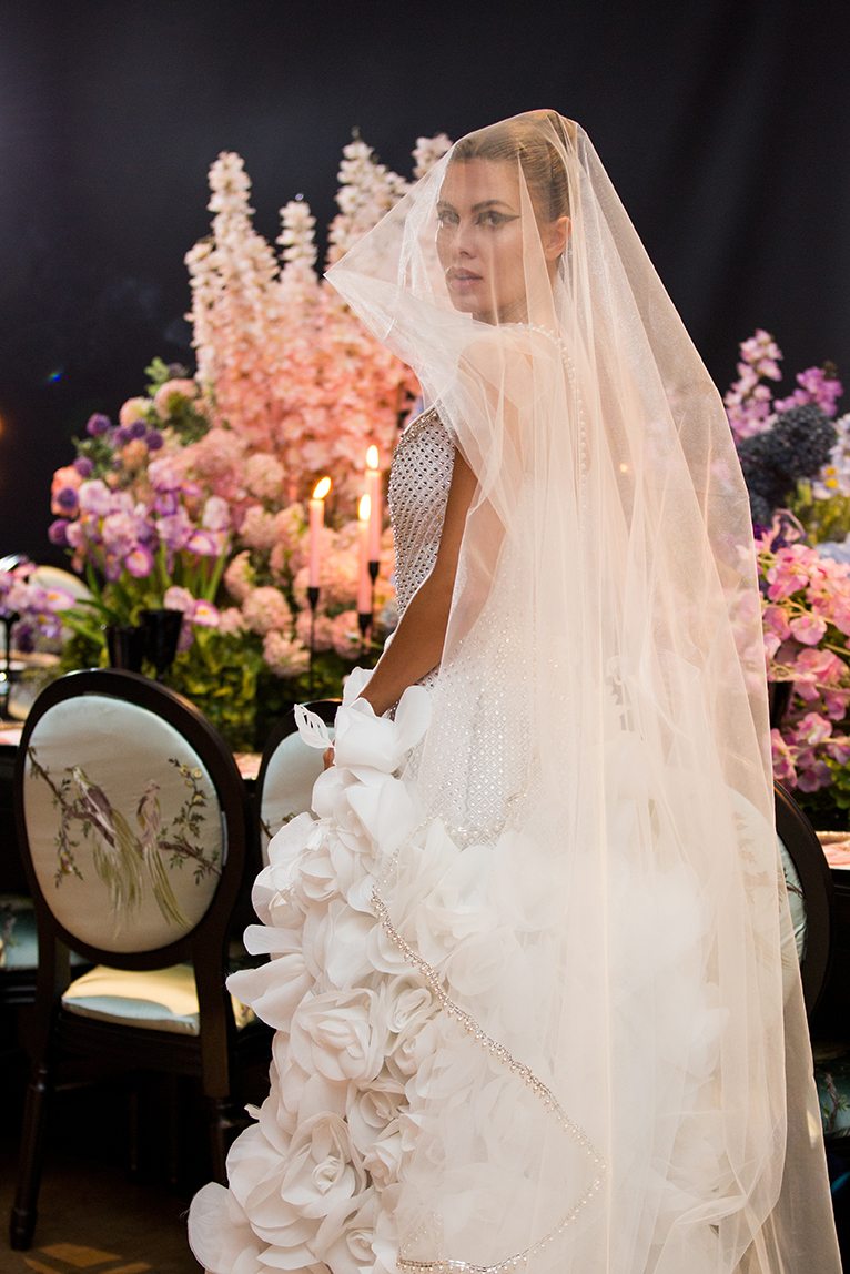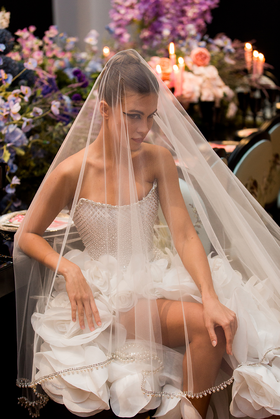 A bride wears a flowing white wedding dress adorned with large floral designs and a long veil. She stands in front of a table decorated with vibrant floral arrangements in pink, purple, and lavender hues, with lit candles in the background.